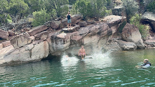 The next morning, we headed for the river. While everyone was getting ready, Laurin and I took the kids up to the new playground. Each year the campsite makes some sort of improvement. We're still waiting for the volleyball or basketball courts to be completed, but we enjoy the amenities this site has. Finally, we grabbed our paddle boards, loaded up the raft, and headed to the river. This is mine and Jeff's favorite part of the trip. There are plenty of other places that we launch our boat, but only one river we float. Unfortunately, the weather wasn't on our side this year. It was pretty cloudy and occasionally stormy. While we didn't get much rain on the river, the cloud cover made it a little cold for those who got in the water. This deterred most everyone from a second trip down the river, but Jeff and I went anyway. It was actually pretty nice to have the river to ourselves. It was so quiet and peaceful as we floated down the beautiful canyon.